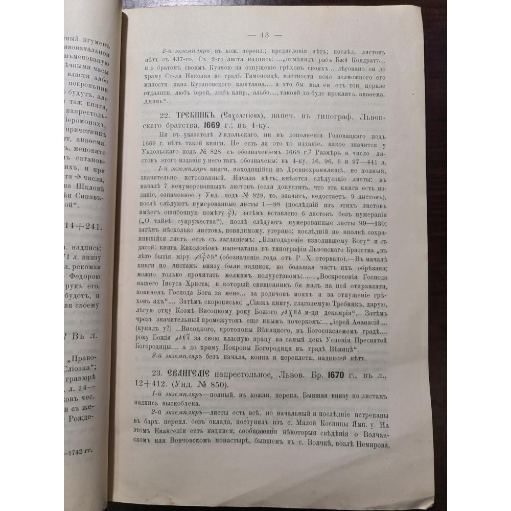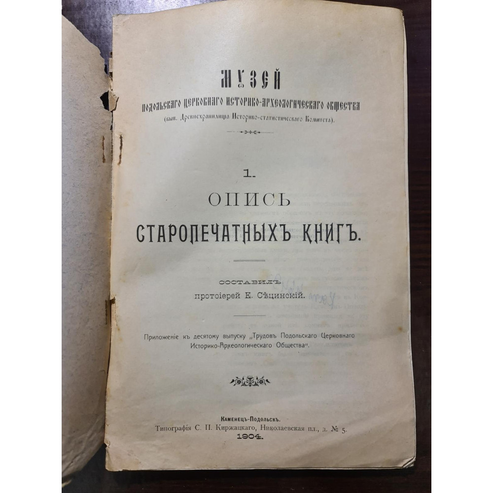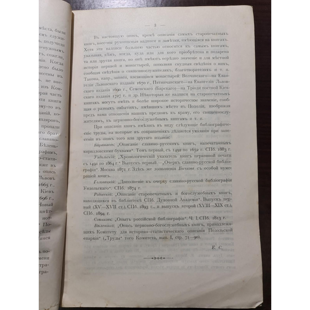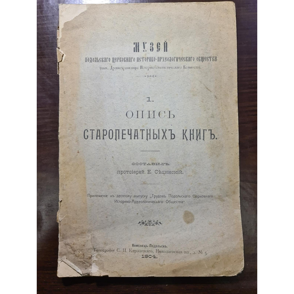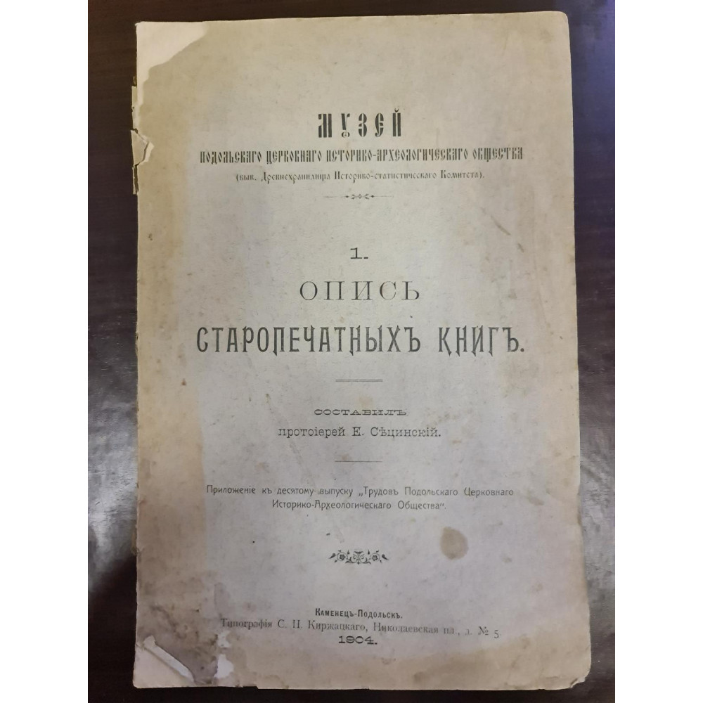 Рідкісне дореволюційне видання, що є каталогом стародруків, складеним протоієреєм Є. Сицинським.
