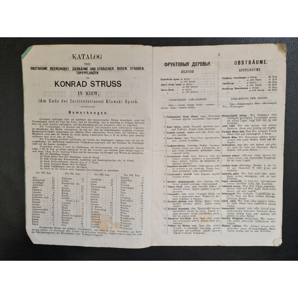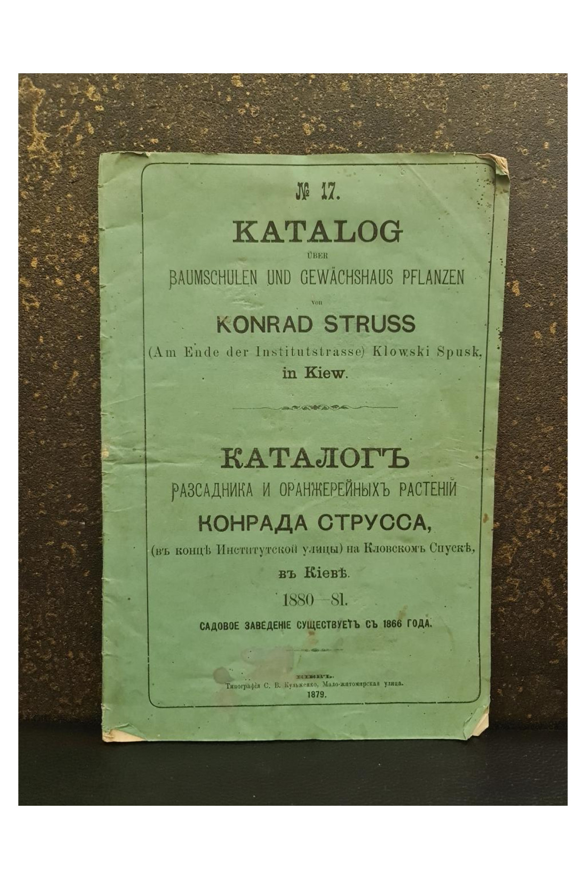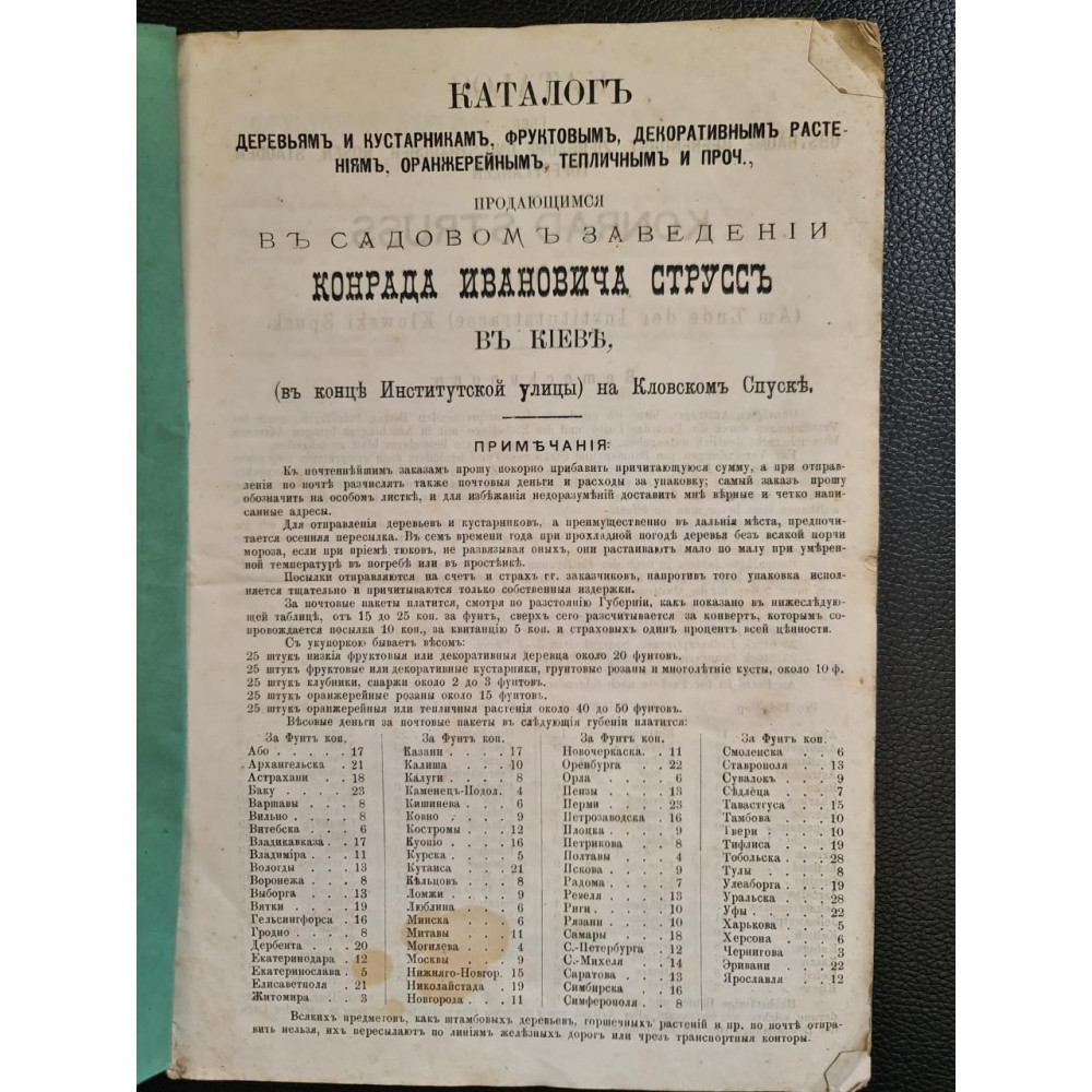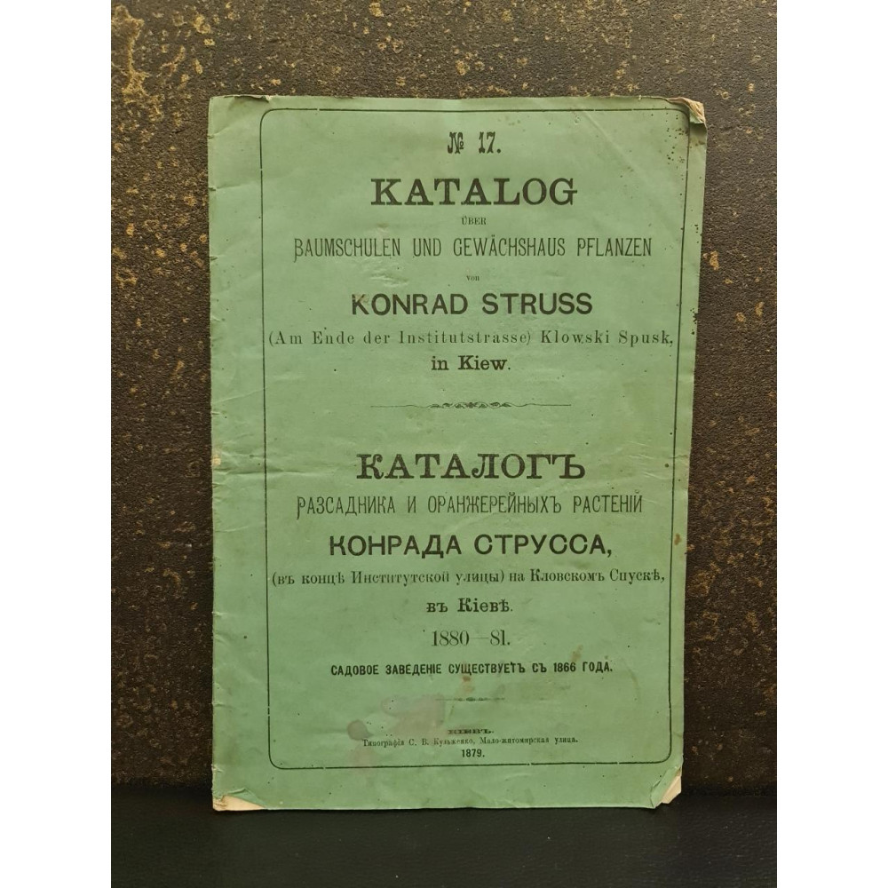Редкое дореволюционное издание — оригинальный каталог питомника и оранжерейных растений, принадлежащего Конраду Струссу, который находился в Киеве на Кловском спуске. Данный каталог охватывает ассортимент растений, доступных для продажи на 1880-81 годы. Представляет значительную историческую и ботаническую ценность, так как отражает ассортимент и развитие садоводства