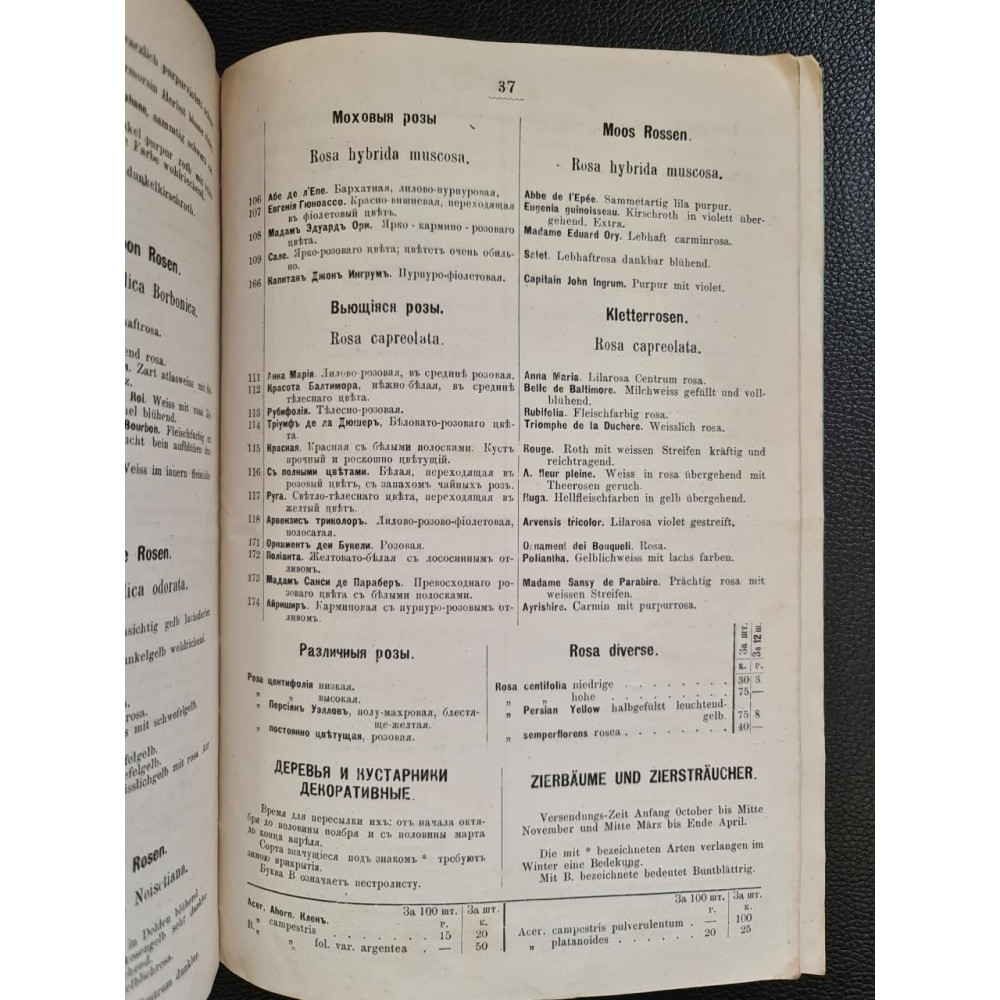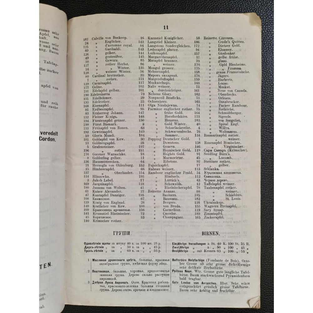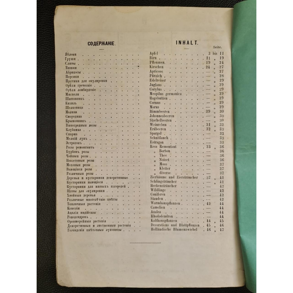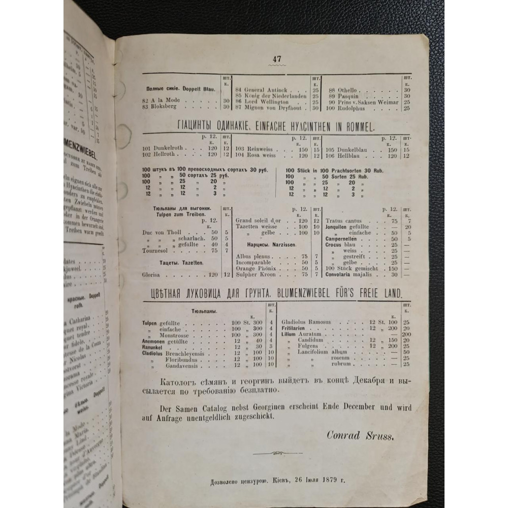 Редкое дореволюционное издание — оригинальный каталог питомника и оранжерейных растений, принадлежащего Конраду Струссу, который находился в Киеве на Кловском спуске. Данный каталог охватывает ассортимент растений, доступных для продажи на 1880-81 годы. Представляет значительную историческую и ботаническую ценность, так как отражает ассортимент и развитие садоводства