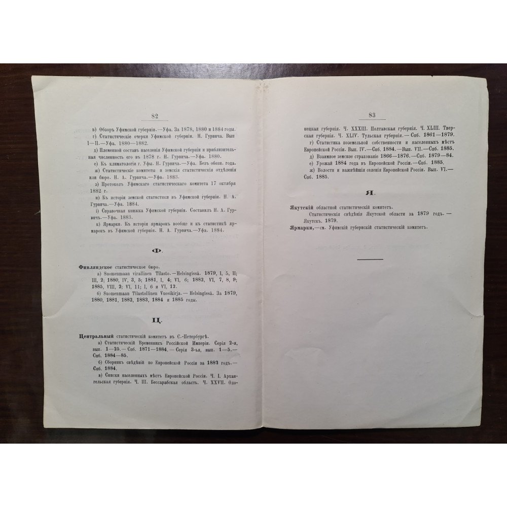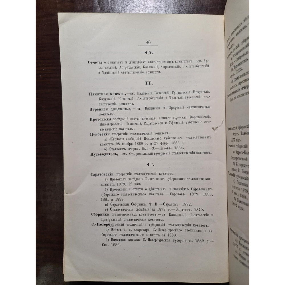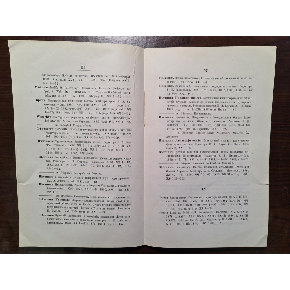 Редкое издание конца XIX века, представляющее собой дополнение к каталогу библиотеки Киевского Общества Естествоиспытателей. Книга включает в себя перечень научных и естественнонаучных трудов, поступивших в библиотеку общества в период с 1878 по 1885 год.