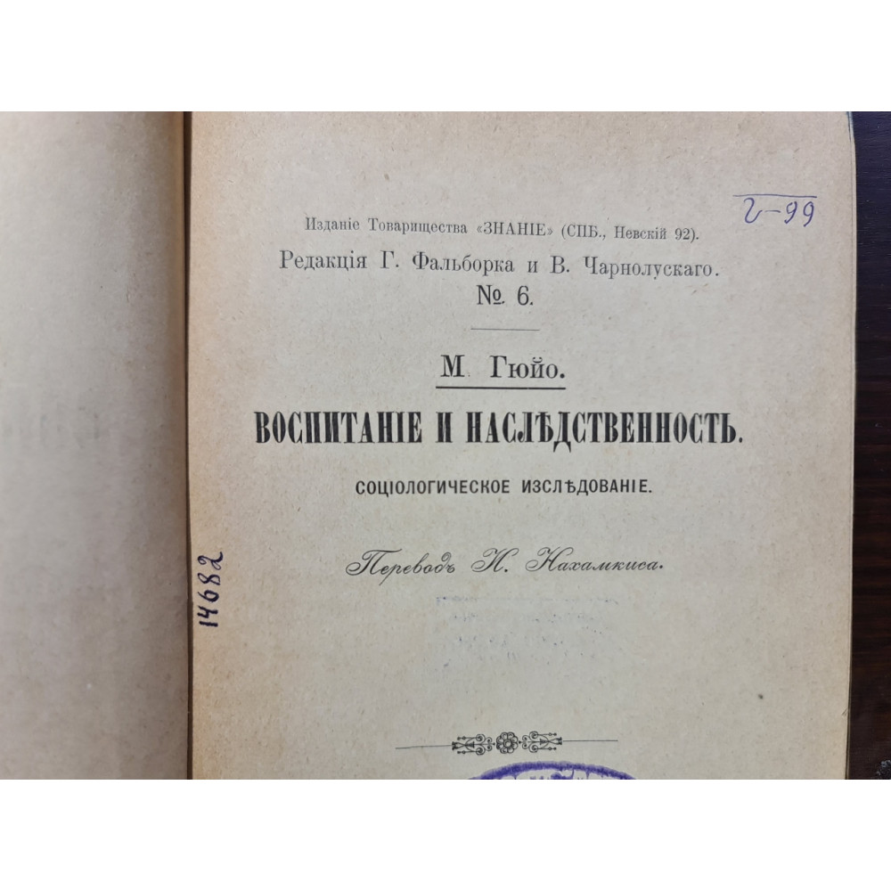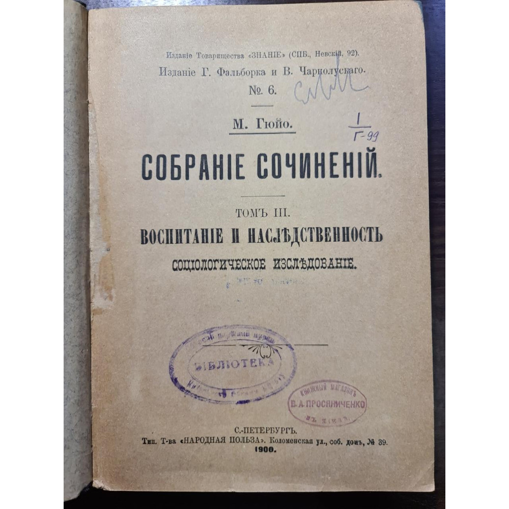 Редкое и ценное издание конца XIX – начала XX века, посвящённое вопросам воспитания, наследственности и их влиянию на развитие общества. Автор – французский философ, социолог и педагог Мари Жан Гюйо (Marie Jean Guyau), известный своими исследованиями в области морали, образования и социальной философии.