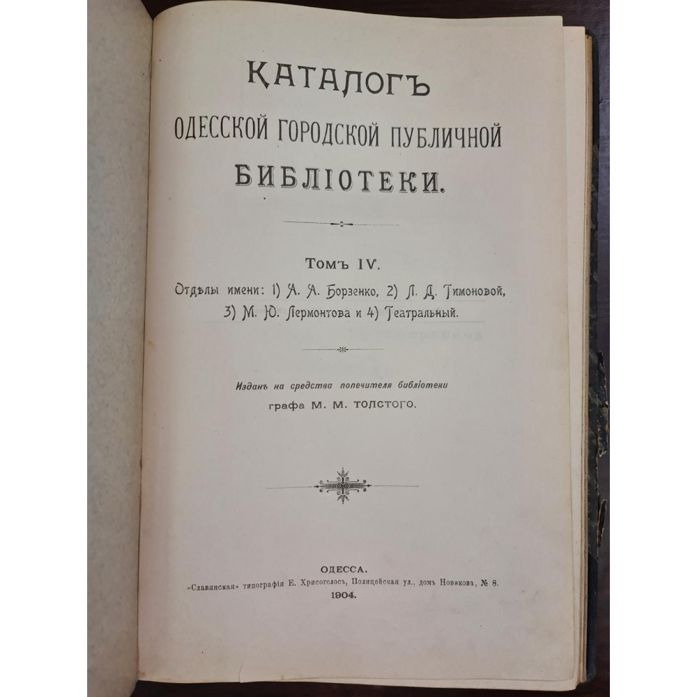Редкое библиографическое издание начала XX века, представляющее собой один из томов каталога Одесской городской публичной библиотеки. Том IV включает перечень книг, сгруппированных по следующим разделам: