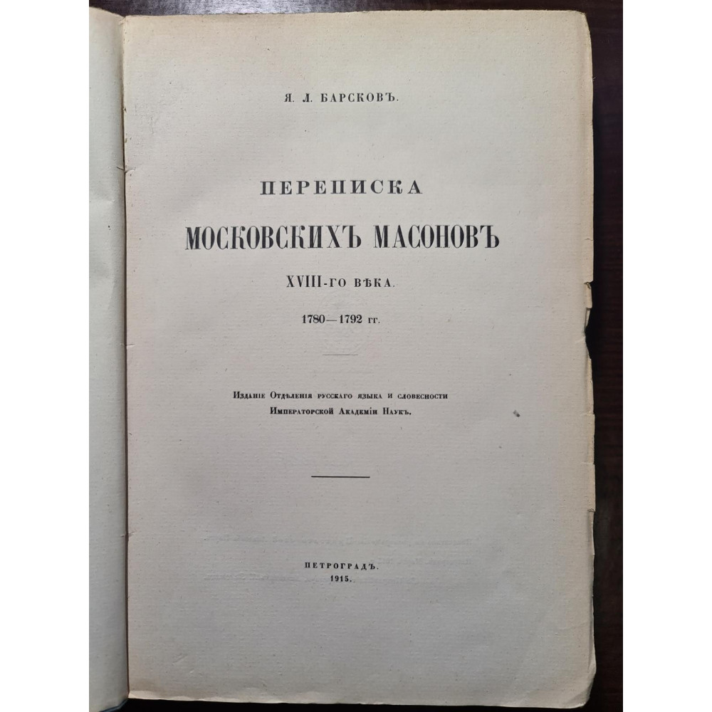 Книга «Переписка московских масонов XVIII-го века. 1780–1792 гг.» под редакцией
