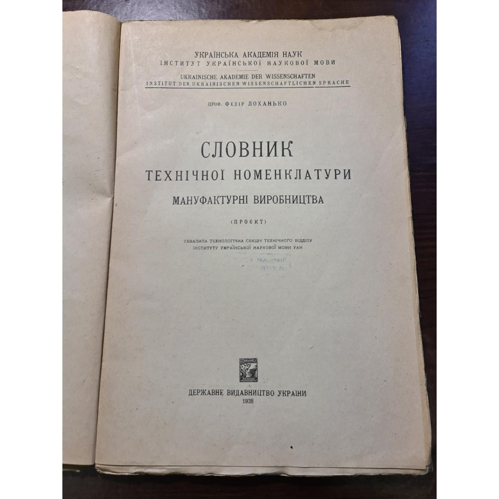 В 1928 году Институт украинского научного языка Украинской академии наук издал «Словарь технической номенклатуры. Мануфактурные производства (проект)», заключенный Ф. Лоханьком. Этот словарь был частью серии «Материалы к украинской терминологии и номенклятуре» (том XIV) и содержал 104 страницы